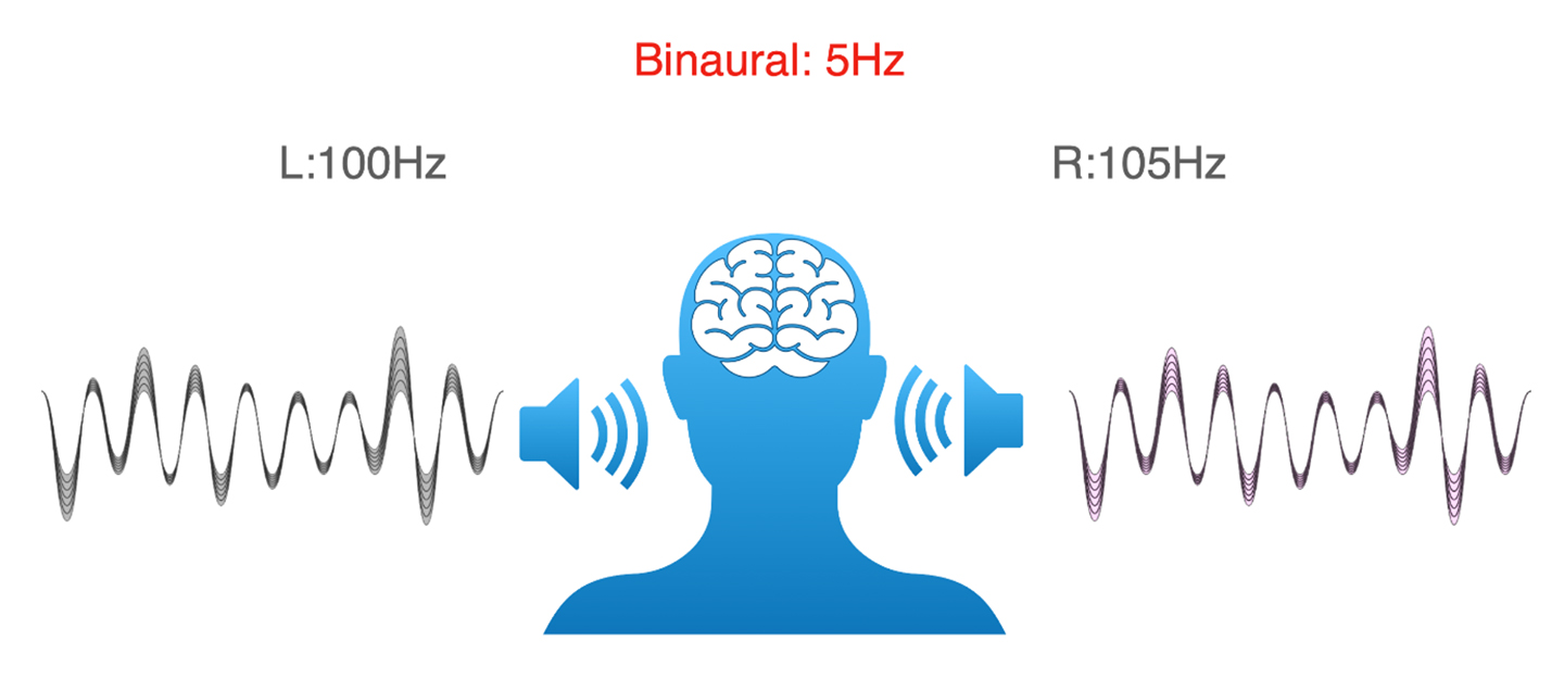 Sound therapists use analog instruments or frequency generators(digital) to generate binaural beats. In essence, these are 2 frequencies of small difference played in each ear (angle of 180’). One is put on the right ear (side) and other on the left (ear) side. Once the listener puts the headphones on, the brain creates a third frequency, called the phantom frequency and this frequency is the binaural beat. In essence the third frequency - binaural beat relates to different brain states and entrains the brain to a wanted state.