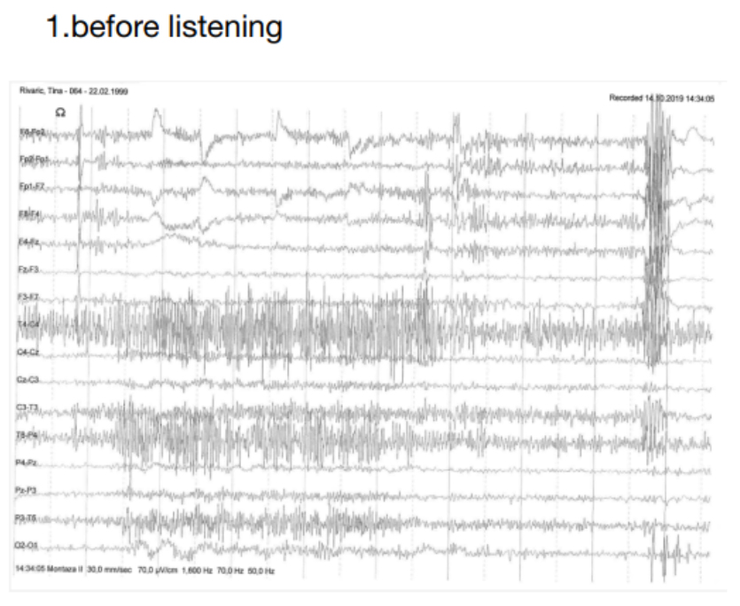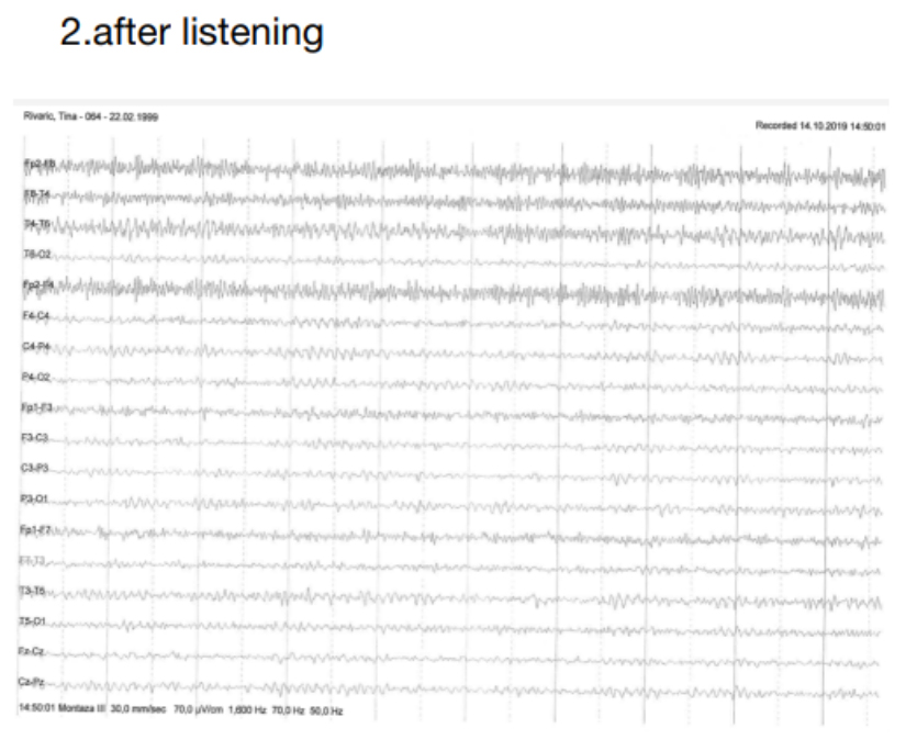 First EEG shows high beta activity, very high in peak which means the client simpaticus is active, and he is in a mood of stress and tension. The second EEG shows the clients brain activity after listening Sonic Pill Relaxation. The tension is gone and we can see a beautiful alpha brain activity.